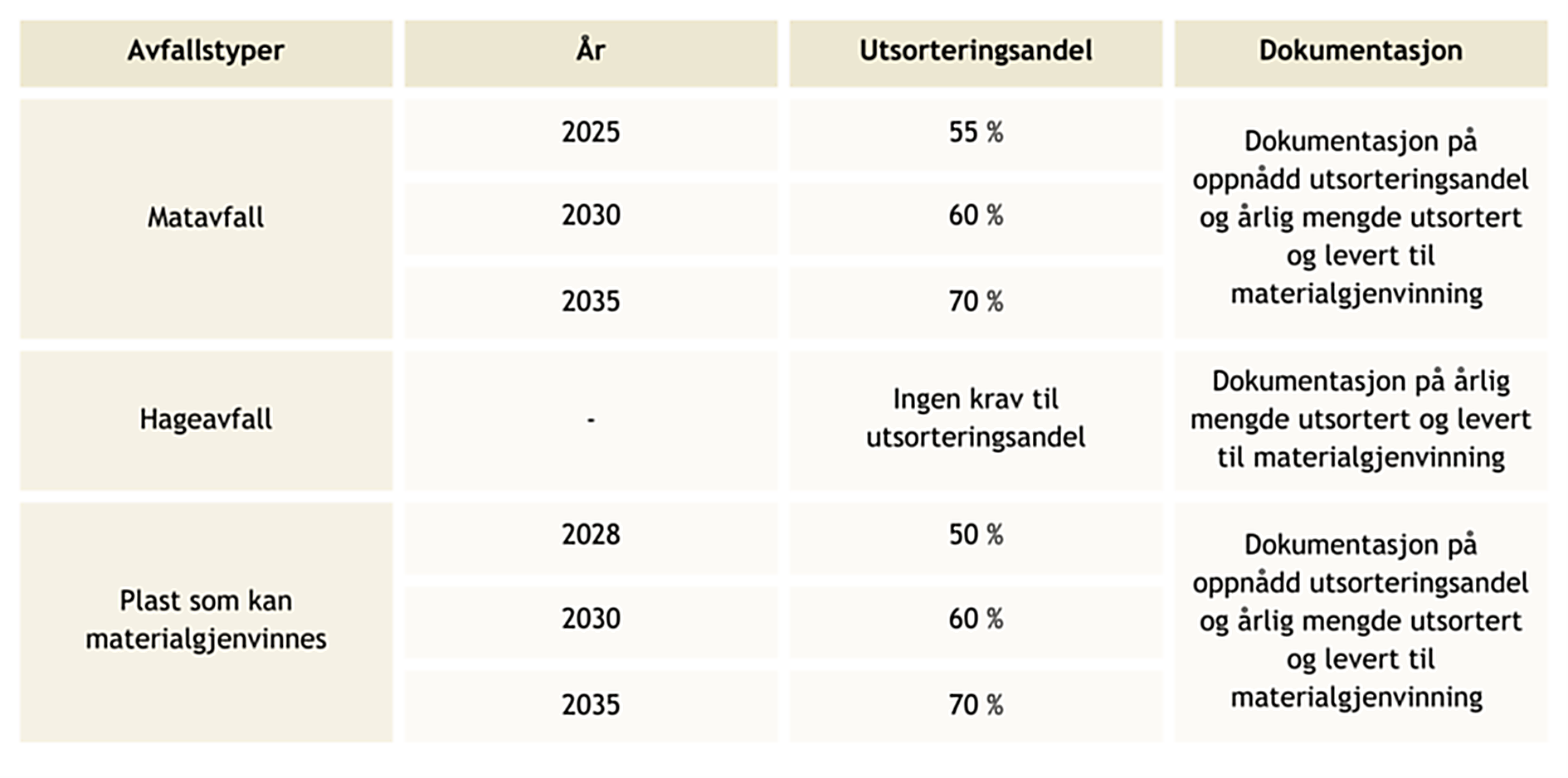 Myndigheitene har innført krav om utsortering av enkelte avfallstypar. Plast, papp- og papiravfall, samt glas- og metallemballasje har fått nye krav frå 2028. Matavfall har allereie fått eit krav om 55% utsortering frå 2025. For å dokumentere om krava blir nådde, skal det gjennomførast plukkanalysar.